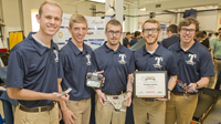 A combat robot designed by mechanical engineering majors Kody Snyder from Burnettsville, Indiana, Kyle Munger from Greensburg, Indiana, Stone Miguel from Fort Wayne, Indiana, Jonathan Phillips, from Royal Center, Indiana, and Braden Hale, an electrical engineering major from Scottsburg, Indiana, earned a Silver Award during the National Robotics Challenge (NRC) competition April 12-13 in Marion, Ohio.