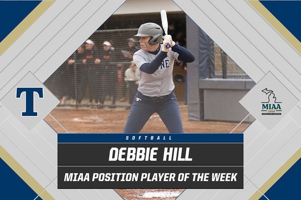 The Trine University softball team has been honored by the Michigan Intercollegiate Athletic Association (MIAA) for MIAA Softball Position Player of the Week for the second time this season. Debbie Hill was tabbed with the award for the first time in her career.