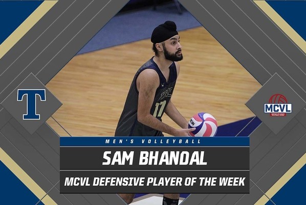 Sam Bhandal of the Trine University men's volleyball team has been named Midwest Collegiate Volleyball League (MCVL) Defensive Player of the Week following four victories in the last week. It is the first MCVL award Bhandal has received in his career.