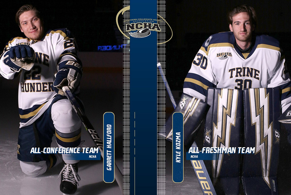 A pair of Trine University men's hockey team student-athletes have earned end of season honors from the Northern Collegiate Hockey Association (NCHA), the conference has announced. Fifth-year senior Garrett Hallford has been named to the NCHA All-Conference Team while Kyle Kozma was named to the All-Freshman Team.