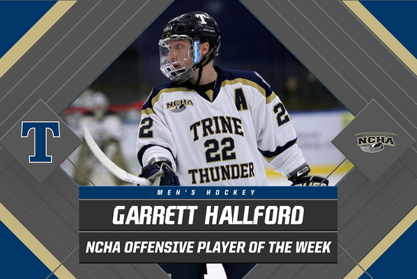 Fifth-year Garrett Hallford has been named this week's Northern Collegiate Hockey Association (NCHA) Offensive Player of the Week after leading the Trine University men's hockey team in a sweep of Marian (Wis.) University.