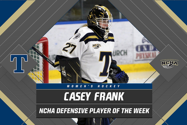 Freshman Casey Frank has been named this week's Northern Collegiate Hockey Association (NCHA) Defensive Player of the Week after securing the Trine University women's hockey team's first two wins of the season in net.