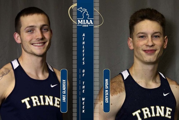 The Trine University men's track and field team had two recipients of the Michigan Intercollegiate Athletic Association (MIAA) Athlete of the Week award. Jake Gladieux and Greysen Spohn won the conferences Men's Track and Field Athlete of the Week awards following record-breaking individual performances at the Indiana Tech Strive for Greatness Invitational.